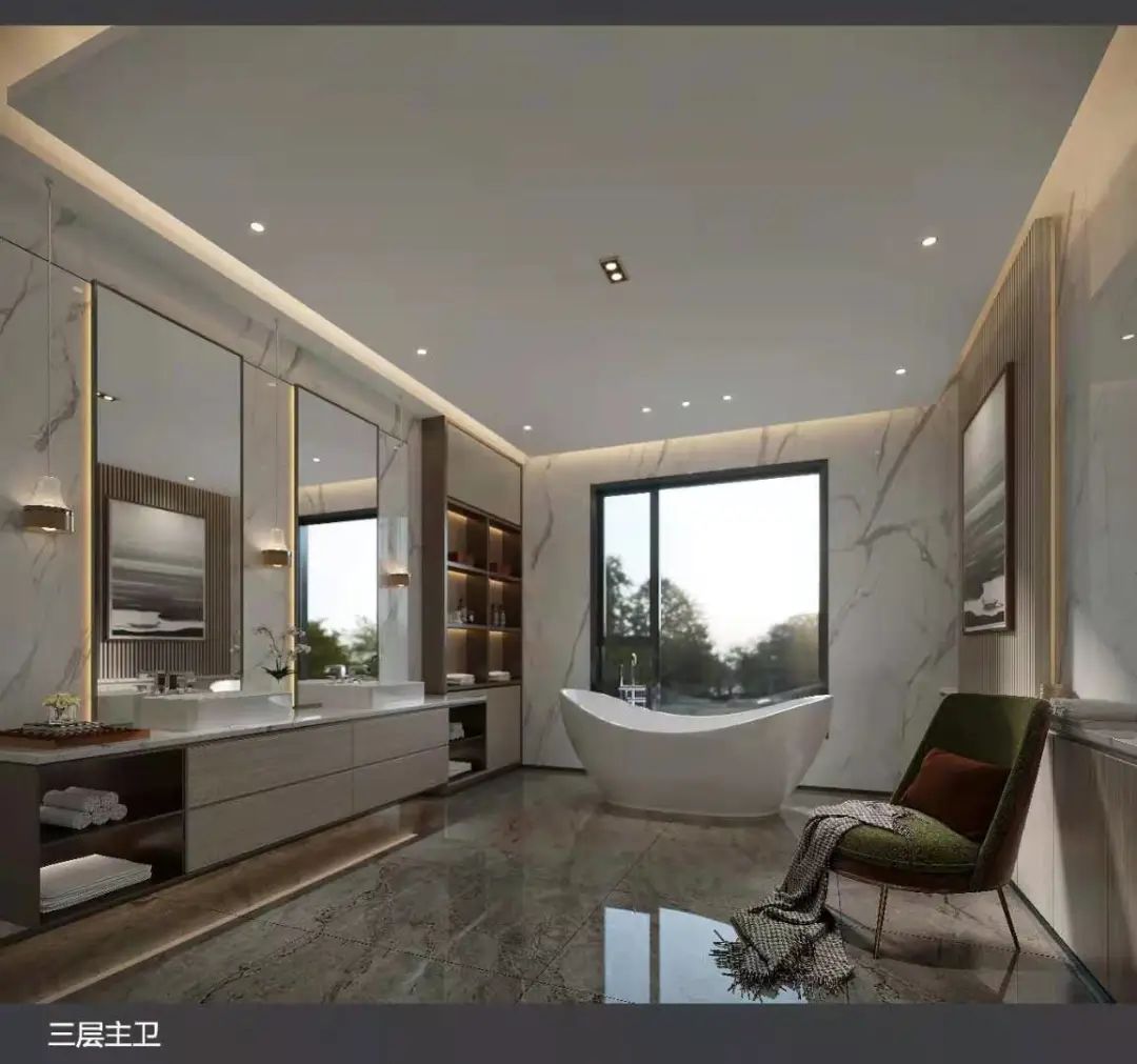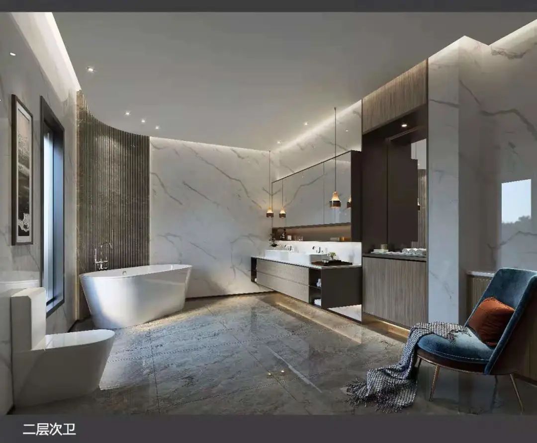 延續(xù)主衛(wèi)拼色大理石和木質(zhì)設(shè)計,浴缸的朝向私密又不失對視野的把握,智能化家居的選擇更是年輕人對便捷生活,品質(zhì)生活的選擇。